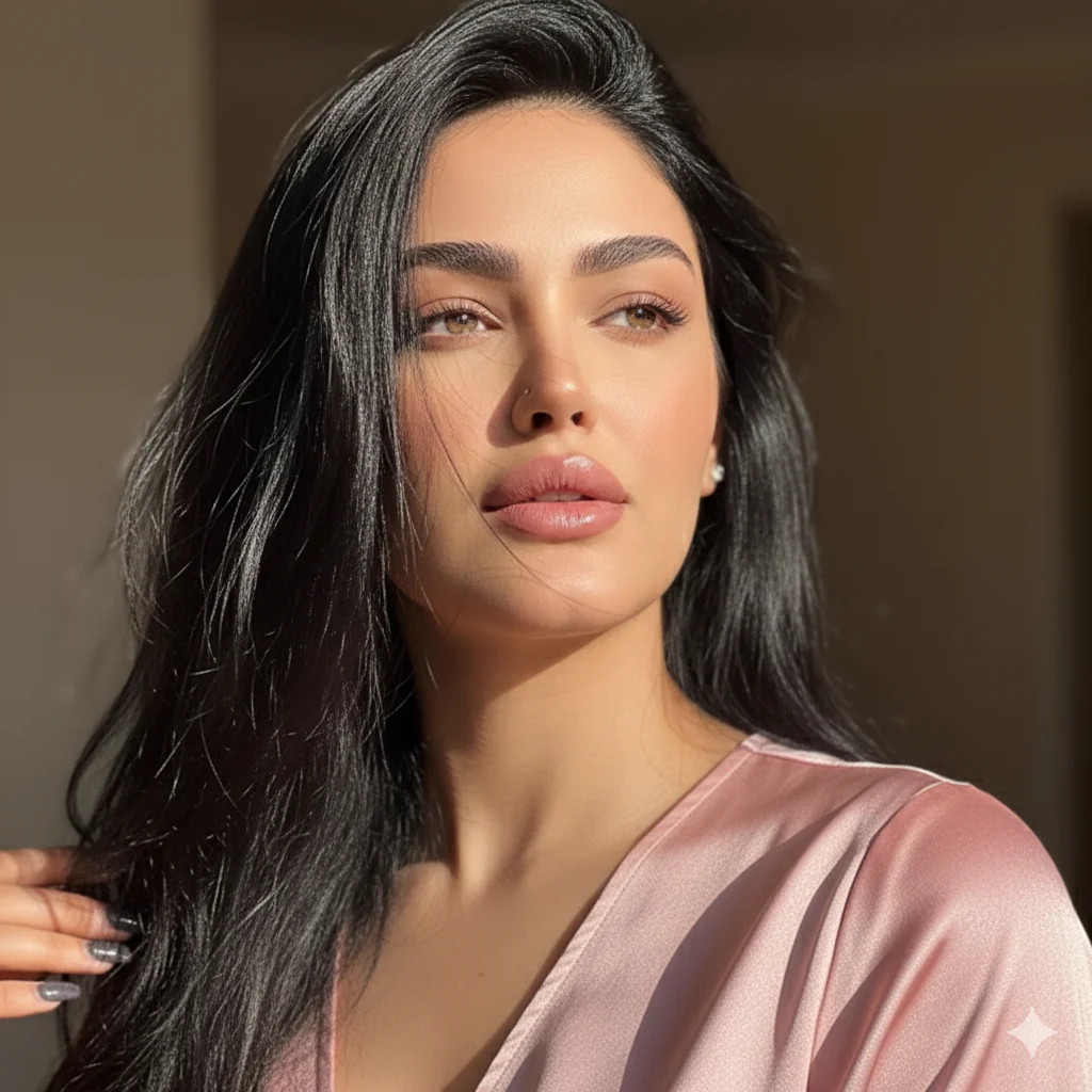 Close-up portrait with natural light illuminating cheekbones and lips, creating a light weight silk aesthetic.