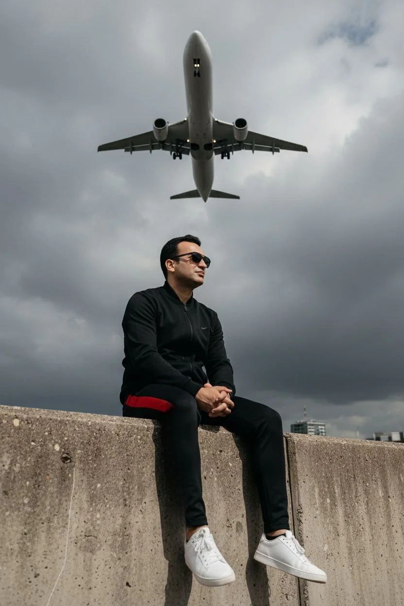 Confident pose on a black beanbag chair with dramatic directional lighting and high contrast.